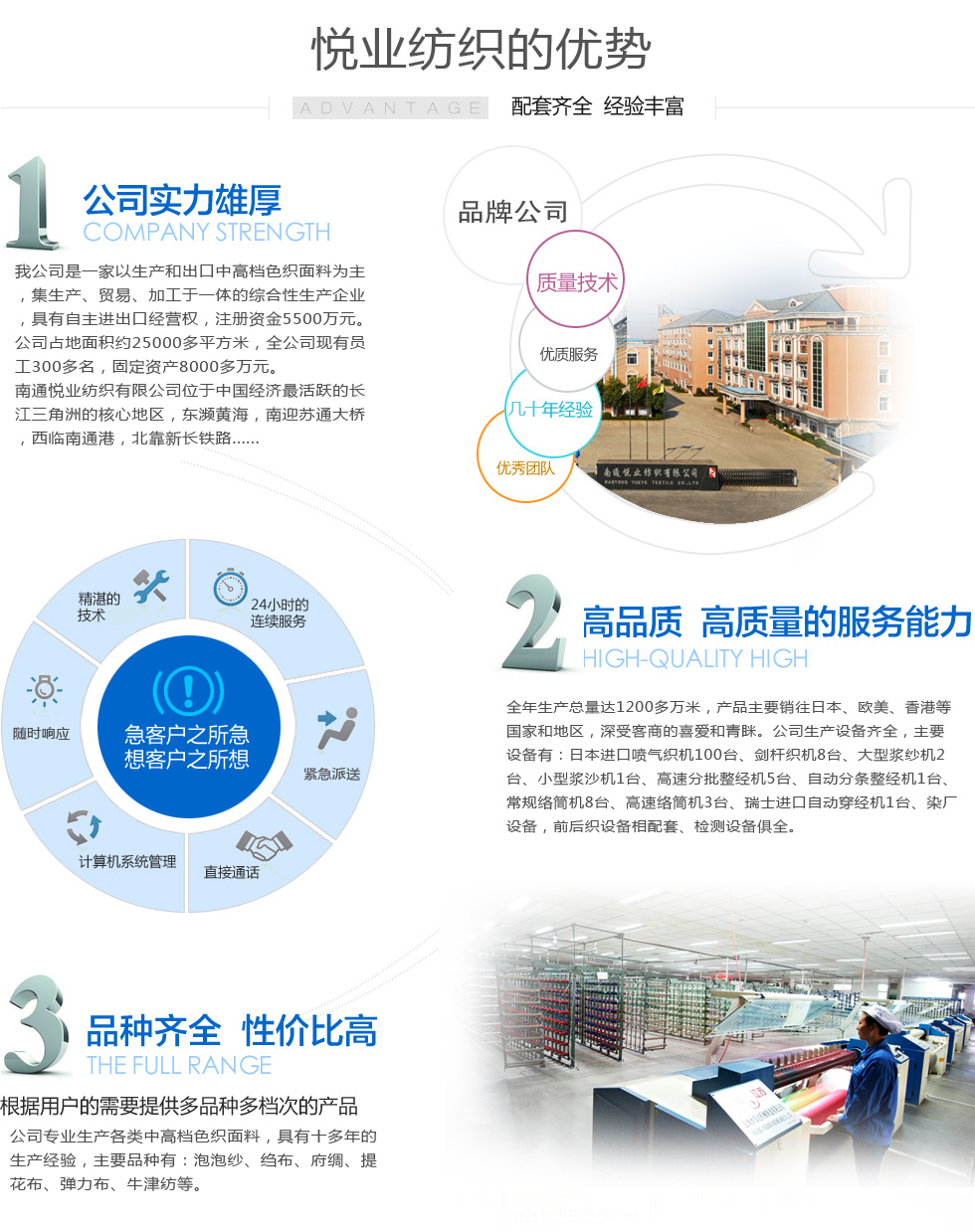 南通悅業(yè)紡織有限公司位于中國經(jīng)濟(jì)最活躍的長江三角洲的核心地區(qū)、中國近代第一城—江蘇省南通市,是一家以生產(chǎn)和出口中高檔色織布為主業(yè)的集生產(chǎn)、貿(mào)易、加工于一體的企業(yè),具有進(jìn)出口經(jīng)營權(quán),注冊資金5500萬元。 公司常年生產(chǎn)各類中高檔色織面料,品種有:全棉色織布,cvc、T/C、青年布...